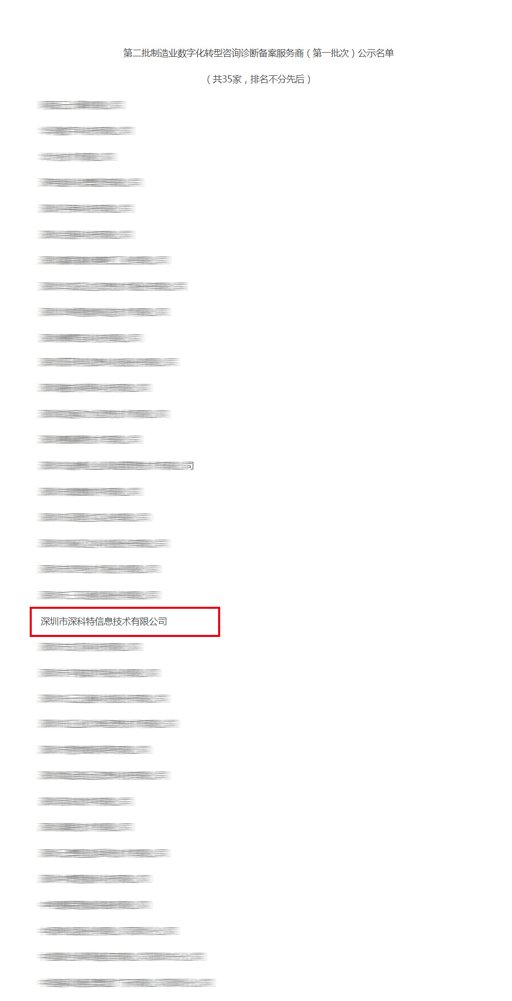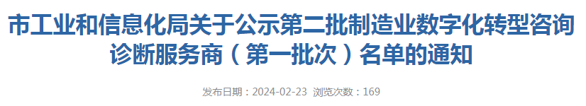 2024年2月23日,深圳市工信局公布了第二批制造业数字化转型咨询诊断服务商(第一批次)名单,深圳市深科特信息技术有限公司再次入选!入选备案服务商是对深圳市工信局专家评委对我司的高度认可。深科特信作为国内领先的MOM/MES解决方案提供商,将不忘初心,持续为制造业赋能,提升核心竞争力。